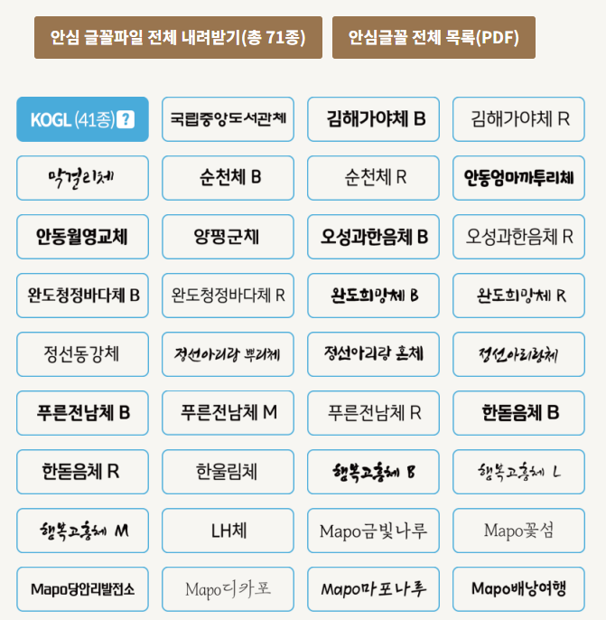 코로나 19로 원격 수업을 진행하며, 문화체육관광부에서 안심글꼴 모음을 다운 받을 수 있게 해놨다. 앞서 말한 네이버 나눔글꼴, 배달의 민족, 지자체 글꼴 포함 71종을 한 번에 혹은 선택적으로 다운 받을 수 있다.