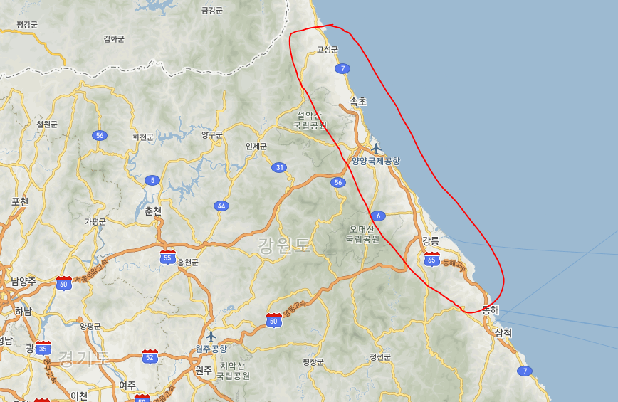 '동고서저'. 동쪽이 높고 서쪽이 낮은 한반도의 강원도 지형을 부를 때 쓰는 말입니다. 태백산맥을 지날 때는 고도가 높고 기온이 낮아, 공기가 압축됩니다. 태백산맥을 지나면서 고도가 낮아지면 온도도 낮아지고 공기는 팽창되기 때문에, 공기의 이동 속도가 빨라집니다. 빨라진 바람의 풍속은 평균 10 - 18 m/s ( 35 - 65 km/h), 심하면 24m/s ( 85 km/h)가 넘습니다. 5 m/s만 불어도 머리가 휘날려서 정신없는 정도입니다.