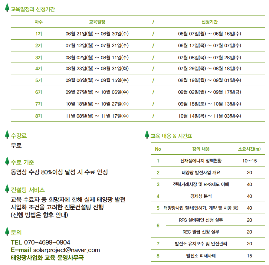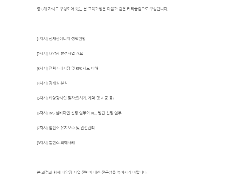 커리큘럼은 위와 같다. 정부의 신재생에너지 정책과 동향, 세계 시장의 현황, 태양광 발전소 건설부터 전력수급계약까지 진행절차순서 및 관련 법규(인허가 , 계약 및 시공), 전력거래시장 및 RPS 제도 이해, REC발급 신청을 통한 대금 결제 방법, 태양광 발전의 원리 및 발전소 관리 방안과 안전관리, 태양광 발전소 피해사례..