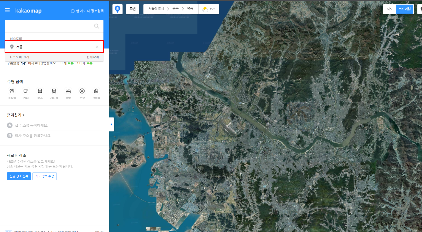 그리고 검색창을 클릭하여 서울 글자를 적는 것이 아니라, 기존에 검색했던 내역인 히스토리 상에서 서울을 찾아 누릅니다.