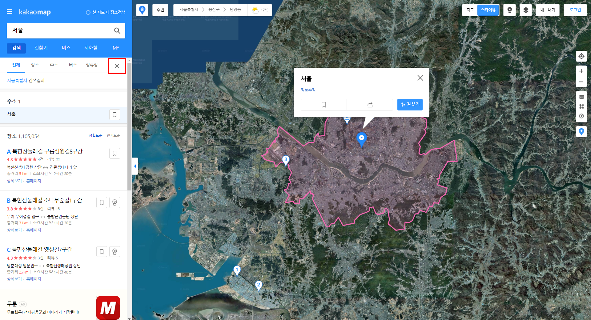 서울이라고 지도에 치면 서울에 방문할 만한 장소도 자동으로 검색됩니다. 1,2,3번 표시가 여기에서는 필요가 없으므로 지워야 해요. 포토샵에서 지우개로 지우고 덮어주고 하면 번거롭겠죠.