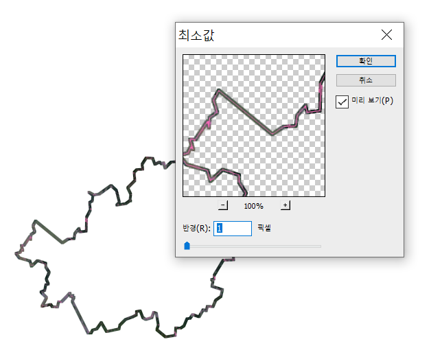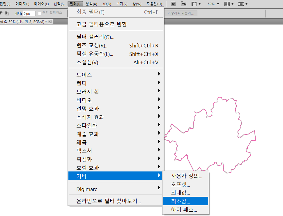 빨간 선 레이어를 선택한 뒤에 포토샵 상단의 필터 - 기타 - 최소값을 누릅니다.