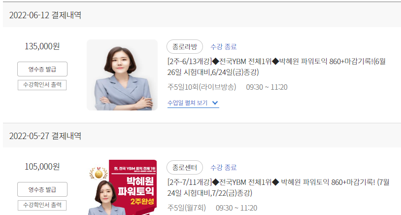 그렇게 한 번을 더 보려 했는데 결국엔 2번을 더 봅니다. 이번엔 YBM 강의도 끊었습니다. 처음에 2주 단기권을 끊었다가 점수가 안 좋을 거 같아 뒤늦게 2주 단기를 한 번 더 끊었습니다.