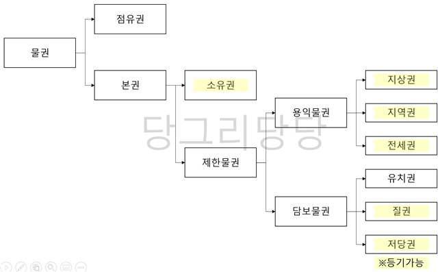 - 점유권과 본권 : 점유권은 실질적으로 소유하고, 사실적 지배하에 있을 때다. 마우스를 쥔 상태로 마우스에 대한 권리를 주장하는 것과 같다. 반면, 본권은 사실적으로 지배하고 있지 않더라도 권리를 인정받는다.